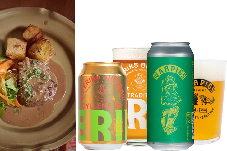 Den gräddiga, mustiga och kryddiga smaken hos Filé med pepparsås och potatisfondant rekommenderas tillsammans med S:t Eriks Gyllene IPA respektive WarPigs Wheezin’ The Juice. Ölens humlearomer förstärks liksom maträttens alla smaker, men på olika sätt. Upptäck skillnaden.